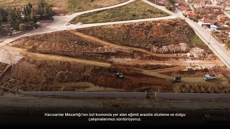 Hacısarılar Mezarlığı'nın üst kısmında yer alan eğimli arazide düzleme ve dolgu çalışmaları sürdürülüyor. Perde beton çalışmaları tamamlanmış olup, gerekli düzenlemelerin bitirilmesiyle birlikte mezarlık kapasitesinde önemli ölçüde artış sağlanacak.
