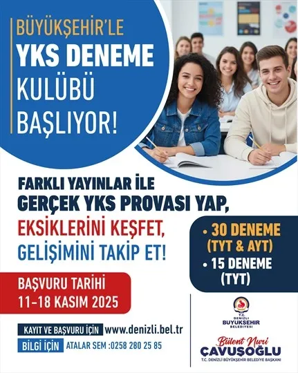 Denizli Büyükşehir Belediyesi, üniversite sınavına hazırlanan gençlere yönelik "YKS Deneme Kulübü" projesini başlatıyor. Öğrenciler, farklı yayınevlerinden hazırlanmış deneme sınavlarıyla gerçek YKS provası yapma imkanı bulacak.