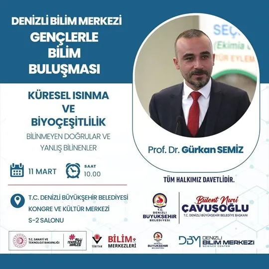 Haftanın ilk programı olan “Gençlerle Bilim Buluşması” 11 Mart 2026 Çarşamba günü saat 10.00’da Denizli Büyükşehir Belediyesi Kongre ve Kültür Merkezi S2 Salonu’nda gerçekleştirilecek. Pamukkale Üniversitesi Öğretim Üyesi Prof. Dr. Gürkan Semiz’in konuk olacağı “Küresel Isınma ve Biyoçeşitlilik: Bilinmeyen Doğrular ve Yanlış Bilinenler” başlıklı söyleşide, ekosistemler üzerindeki değişimler ve biyoçeşitlilik kaybına ilişkin yaygın yanlış algılar bilimsel verilerle ele alınacak. Etkinlikte, sürdürülebilir bir gelecek için çevresel farkındalığın hayati önemi üzerinde durulacak.