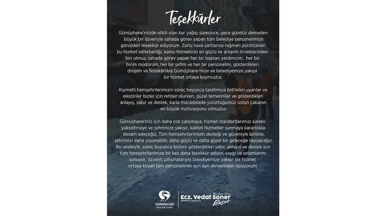 Gümüşhane Belediye Başkanı, kentte etkili olan kar yağışı süresince görev yapan tüm belediye personeline teşekkür etti.