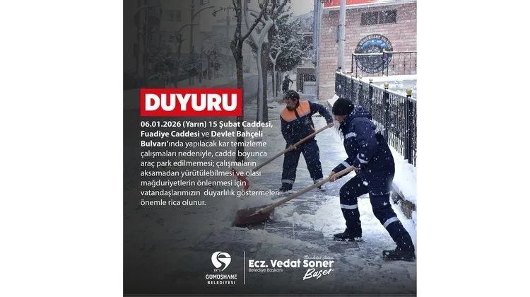 Gümüşhane Belediyesi, 5 Ocak 2026 Pazartesi gününe ait bir duyuru yayımladı.