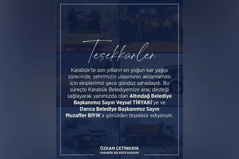 Karabük Belediye Başkanı Özkan Çetinkaya, sosyal medya hesabı üzerinden bir açıklama yaptı. Çetinkaya, "Karabük'te son yılların en yoğun kar yağışı sürecinde, şehrin ulaşımının aksamaması için ekipler gece gündüz sahadaydı. Bu süreçte Karabük Belediyesi'ne araç desteği sağlayarak yanımızda olan Altındağ Belediye Başkanı Sayın Veysel Tiryaki’ye ve Darıca Belediye Başkanı Sayın Muzaffer Bıyık’a gönülden teşekkür ediyorum" ifadelerini kullandı.