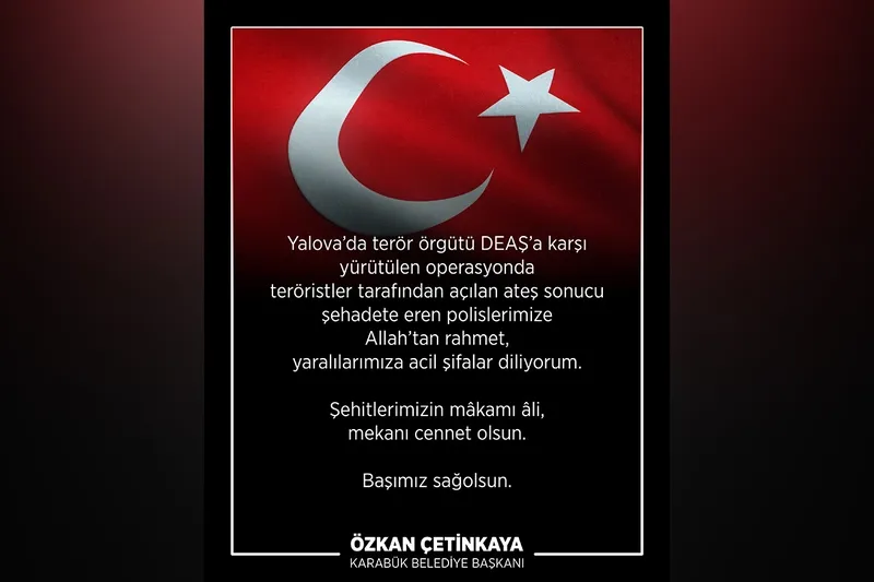 Karabük Belediye Başkanı Özkan Çetinkaya, sosyal medya hesabı üzerinden bir başsağlığı mesajı yayımladı. Çetinkaya, Yalova'da terör örgütü DEAŞ'a karşı yürütülen operasyonla ilgili açıklamada bulundu.
