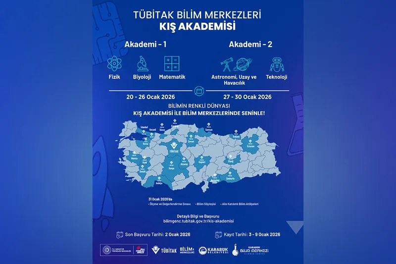Türkiye’nin dört bir yanındaki TÜBİTAK destekli bilim merkezlerinde gerçekleşecek Kış Akademisi programı kapsamında; Akademi 1’de fizik, biyoloji ve matematik; Akademi 2’de ise teknoloji, astronomi, uzay ve havacılıkla ilgili dolu dolu bir program sizleri bekliyor.