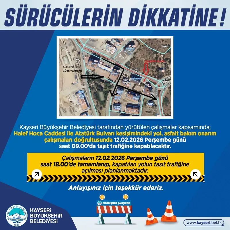 İlgili yol kesimi, 12 Şubat 2026 Perşembe günü saat 09.00'da taşıt trafiğine kapatılacak. Çalışmaların aynı gün saat 18.00'de tamamlanarak yolun yeniden trafiğe açılması planlanıyor.