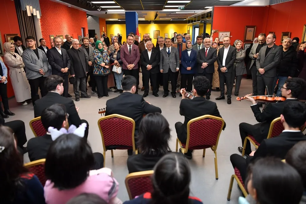 Başkan Memduh Büyükkılıç, kurdele kesimi ile açılışını yaptığı sergideki ebru, tezhip ve hüsnühat eserlerini tek tek inceledi. Öğrencilerin koro halinde seslendirdiği ilahileri dinleyen Büyükkılıç, öğrencileri alkışladı.