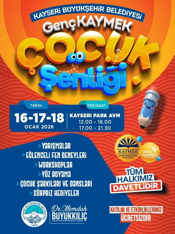Eğitim hizmetlerinin yanı sıra sosyal, sanatsal ve kültürel etkinliklerle gençlerin gelişimine katkı sağlayan Kayseri Büyükşehir Belediyesi bünyesindeki Genç KAYMEK, yarıyıl tatilinde bir çocuk şenliği düzenleyecek. Şenlik, 16 Ocak 2026 Cuma günü saat 15.00'te Kayseri Park AVM -1. katında başlayacak. Etkinlikler, 16, 17 ve 18 Ocak 2026 tarihlerinde, günlük 12.00-21.30 saatleri arasında gerçekleştirilecek.