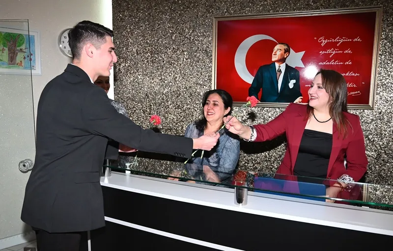 Kemer Belediyesi Gençlik Meclisi Başkanı Mehmet Yalın Erdal ve yönetim kurulu üyeleri, 8 Mart Dünya Kadınlar Günü dolayısıyla Kemer Belediyesi Ana Hizmet Binası'nda çalışan kadın personele karanfil dağıttı.