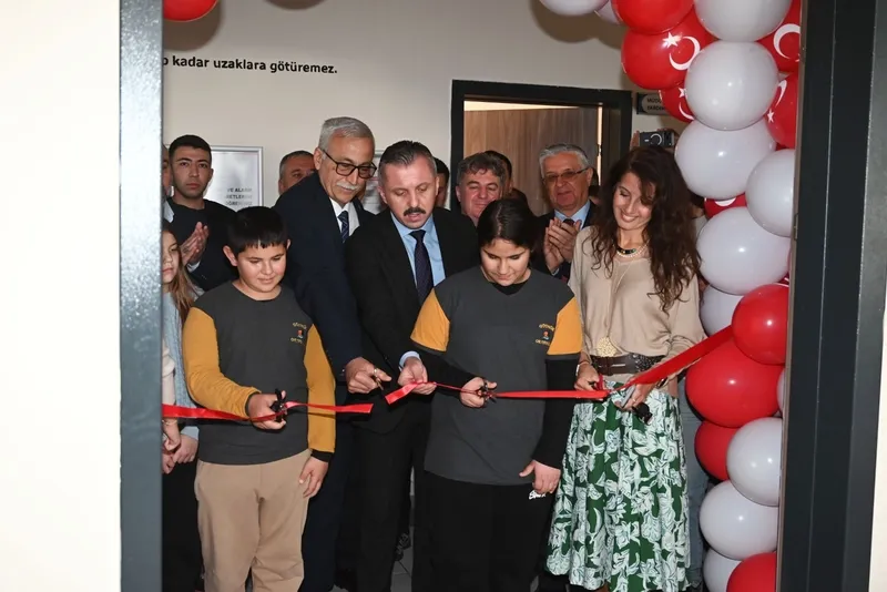 Hayırsever iş insanlarının desteğiyle oluşturulan kütüphanenin açılış kurdelesini Kaymakam Solmaz, Başkan Topaloğlu ve beraberindekiler kesti.