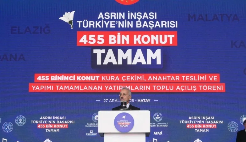 Ulaştırma ve Altyapı Bakanı Abdulkadir Uraloğlu, Cumhurbaşkanı Recep Tayyip Erdoğan'ın katılımıyla Hatay'da düzenlenen 455 Bininci Konut Kura Çekimi, Anahtar Teslimi ve Yapımı Tamamlanan Yatırımların Toplu Açılış Töreni'nde bir konuşma yaptı.