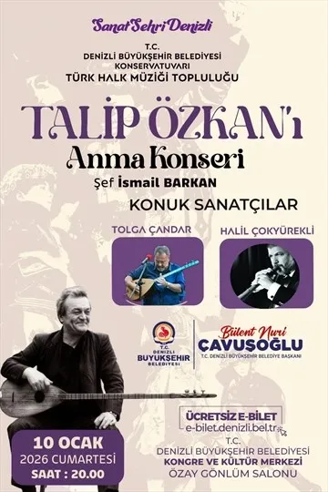 Talip Özkan'ın anısına düzenlenen konser, 10 Ocak 2026 Cumartesi günü saat 20.00'de Denizli Büyükşehir Belediyesi Kongre ve Kültür Merkezi Özay Gönlüm Salonu'nda gerçekleştirilecek. Ücretsiz olarak düzenlenecek konserin biletleri e-bilet.denizli.bel.tr adresinden temin edilebilecek.