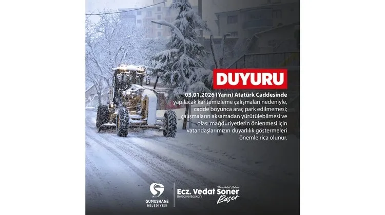 02 Ocak 2026, Cuma Gümüşhane Belediyesi bir duyuru yayımladı. Duyuru metni, belediyenin resmi kanalları aracılığıyla kamuoyuna açıklandı. Gümüşhane,Gümüşhane Belediyesi