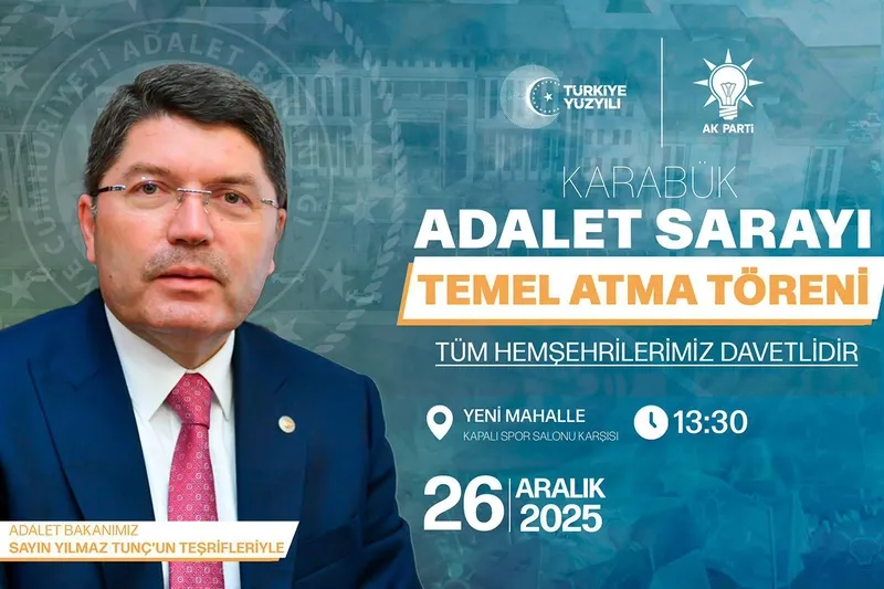 Karabük'te inşa edilecek yeni Adalet Sarayı'nın temel atma töreni, 26 Aralık 2025 Cuma günü gerçekleştirilecek. Törene Adalet Bakanı Yılmaz Tunç'un katılması bekleniyor.
